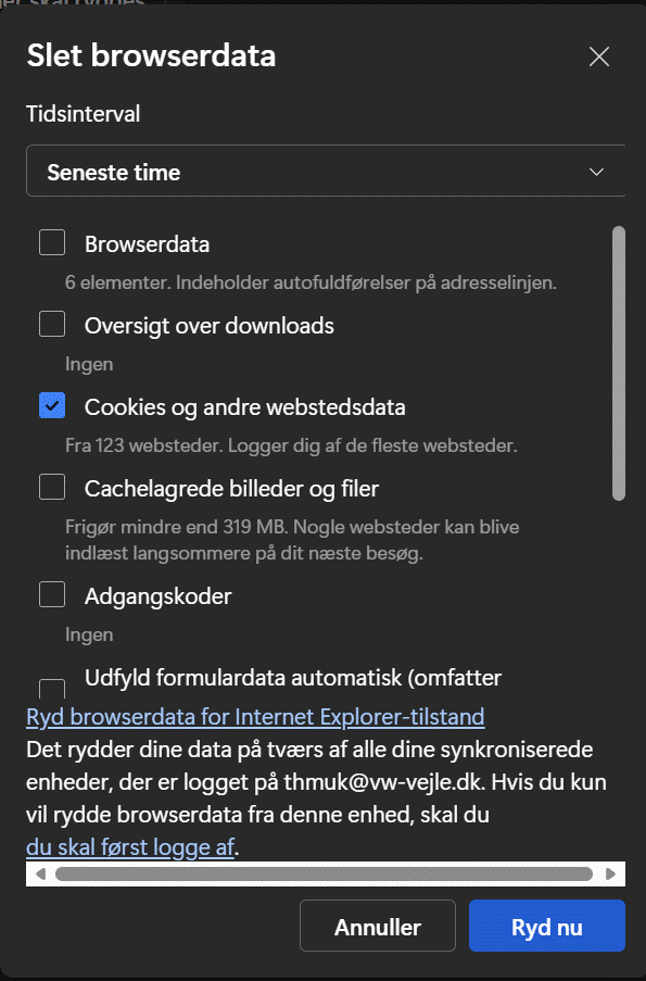 Tryk på [Ctrl]+[Shift]+[Delete] og fjern flueben, så det kun er cookies der er valgt og tryk på [Ryd nu].